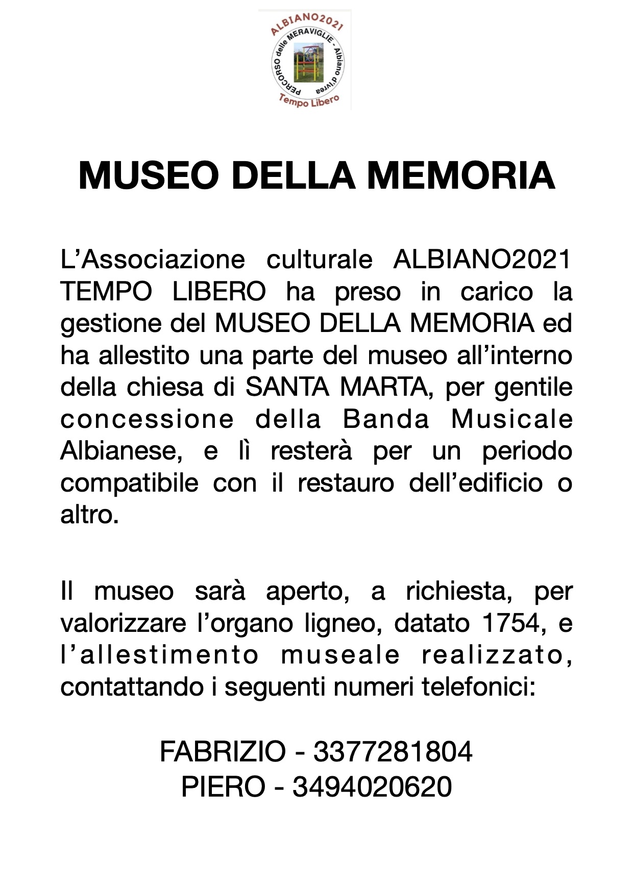 Il Museo sarà aperto, a richiesta, per valorizzare l'organo ligneo, previo contatto telefonico (vedi in allegato)