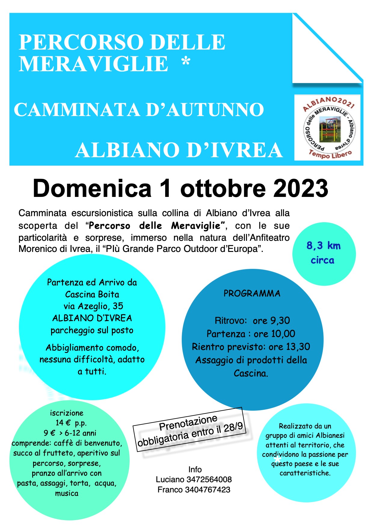Camminata escursionistica di circa 8, 3 km sulla collina di Albiano d'Ivrea alla scoperta del "Percorso delle Meraviglie" con le sue particolarità e le sue sorprese, immerso nella natura dell'Anfiteatro Morenico della Serra - il "Più Grande Parco Outdoor d'Europa".