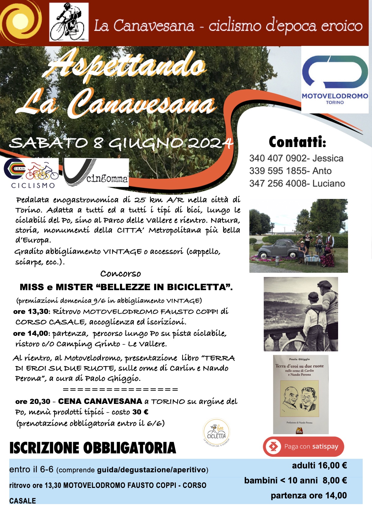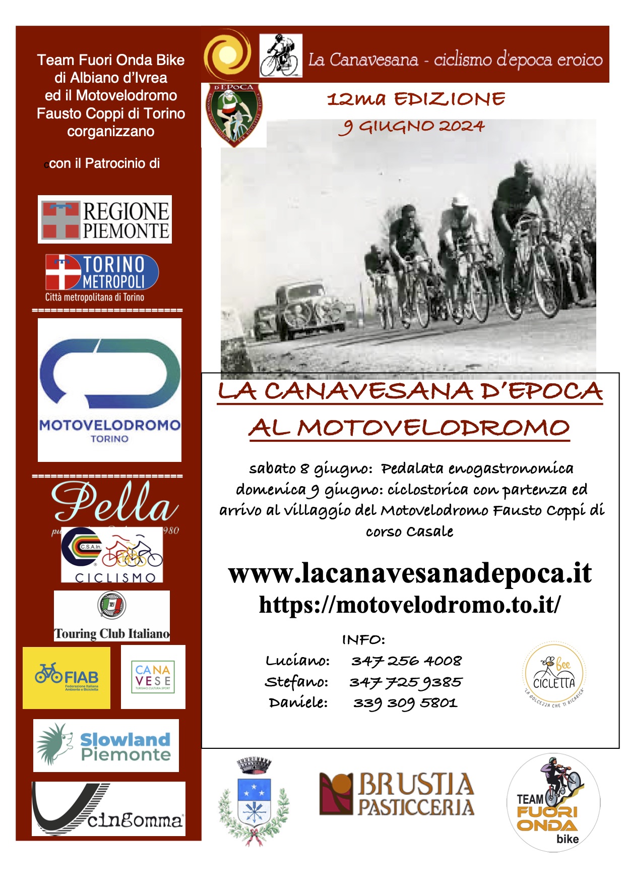 -DOMENICA 9 GIUGNO: LA CANAVESANA D'EPOCA AL MOTOVELODROMO. Ciclostorica con partenza ed arrivo al villaggio del Motovelodromo F. Coppi (per coronare, con IL GIRO D'ITALIA D'EPOCA e la sua 6^ TAPPA, appunto La CANAVESANA, gli eventi ciclistici Internazionali del 2024 quali la 107^ edizione del GIRO D'ITALIA PROF partito da Venaria/Torino, ed il TOUR DE FRANCE con la 3^ tappa che arriverà a Torino nel prox mese di luglio).