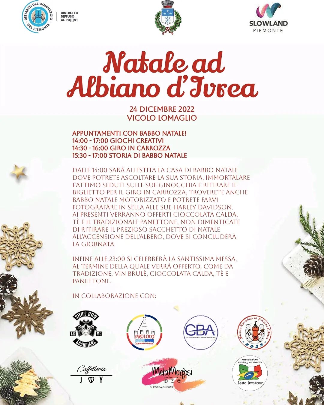 E' tutto pronto per il Natale 2022 ad Albiano d'Ivrea: appuntamento Sabato 24 dicembre 2022 per un momento di comunità e spettacolo per far vivere il periodo natalizio ai più piccoli, ai grandi ed a tutte le famiglie. Il tutto è stato reso possibile grazie alla sinergia tra l'Amministrazione Comunale con commercianti ed associazioni del territorio.