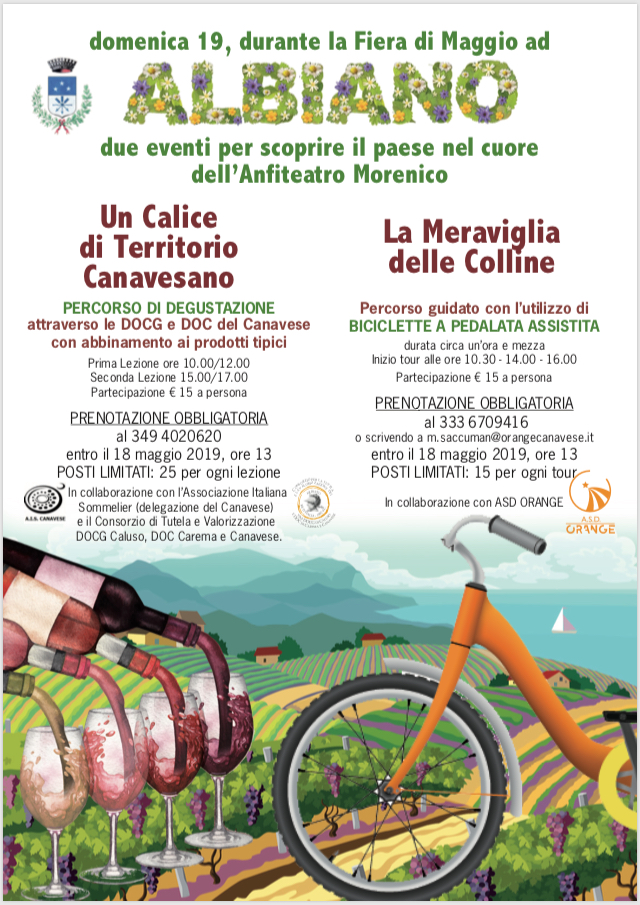 Due eventi per scoprire il paese nel cuore dell'Anfiteatro Morenico: PERCORSO DI DEGUSTAZIONE attraverso le DOCG e DOC del Canavese con abbinamento ai prodotti tipici e percorso guidato con l'utilizzo di BICICLETTE A PEDALATA ASSISTITA.
