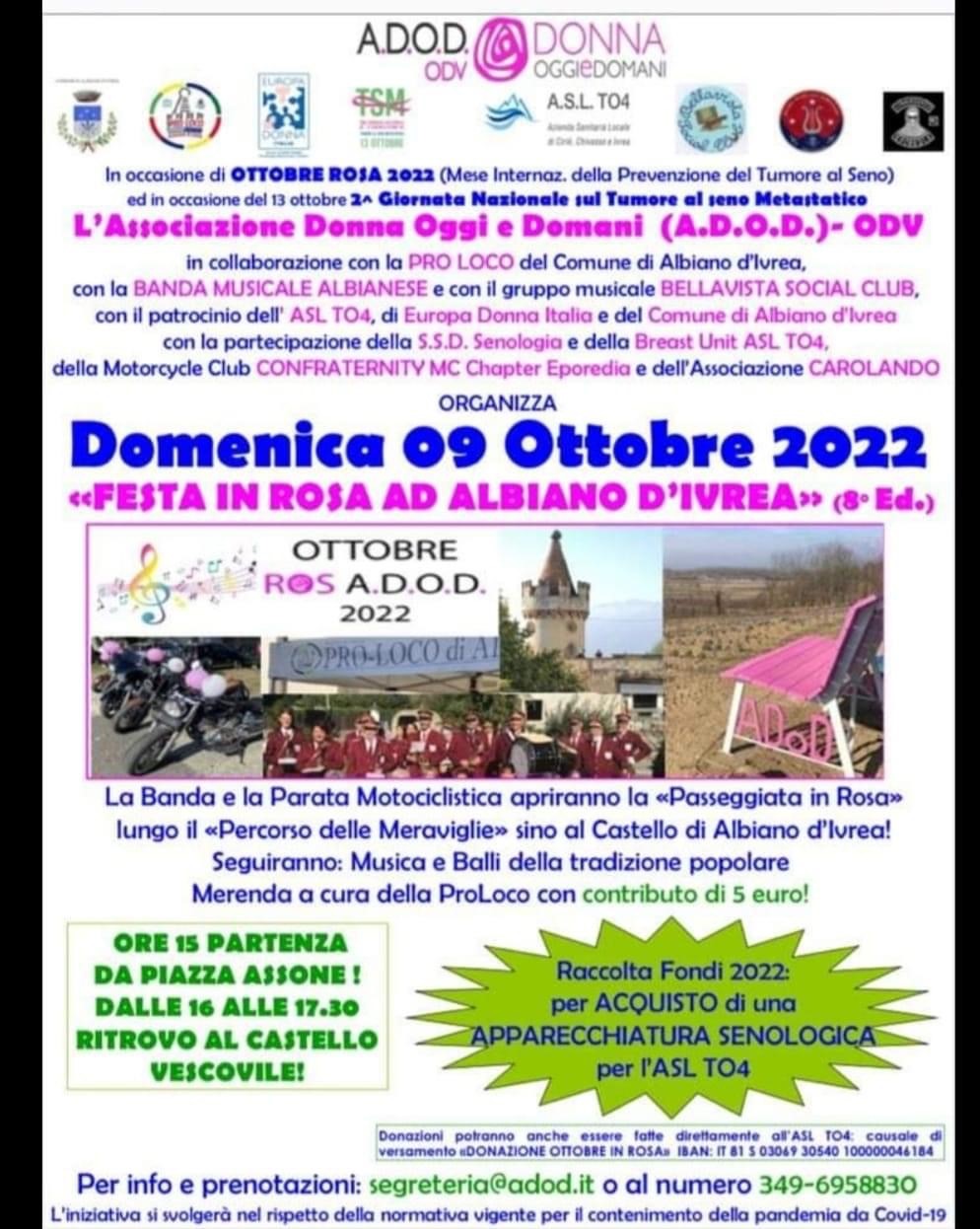 Domenica 9 ottobre alle 15:00 partenza della "Passeggiata in rosa" da Piazza Assone in Albiano d'Ivrea organizzata da Adod (Associazione Donna Oggi e Domani) in occasione del Mese Internazionale della Prevenzione del Tumore al Seno in collaborazione con la Pro Loco di Albiano d'Ivrea, la Banda Musicale Albianese e con il Gruppo musicale Bellavista Social Club.